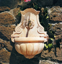 CASTELLO 古城をイメージした壁泉。左右の渦巻き模様と下部の何気ないタテの線がうまく調和を保っているように見えます。仕上がりよりも古風でアンティーク感溢れる逸品。