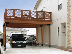 文字通り、ウッドデッキとガレージ屋根を組みあわせた一石二鳥?タイプ。ガレージバルコニーの床は屋根の機能を充実させる為、樹脂デッキが多いのですが、それでは趣きがない、と言われる方のための木製デッキ。ガレージスペースを100%活用すると、かなり広いものなのです。 |