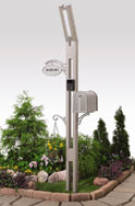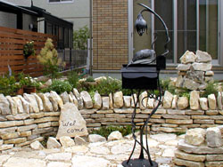 ユリの花をモチーフにして、優雅さを出しました。表札は、ガスによる切抜き加工法で、名前を抜いています。一番上のユリの花にはライトが入っています。インターホンとポスト付き。高さ:1.7m。 |