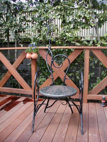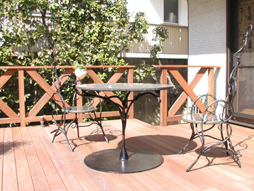 ウッドデッキには、ロートアイアンのテーブルセット↑
